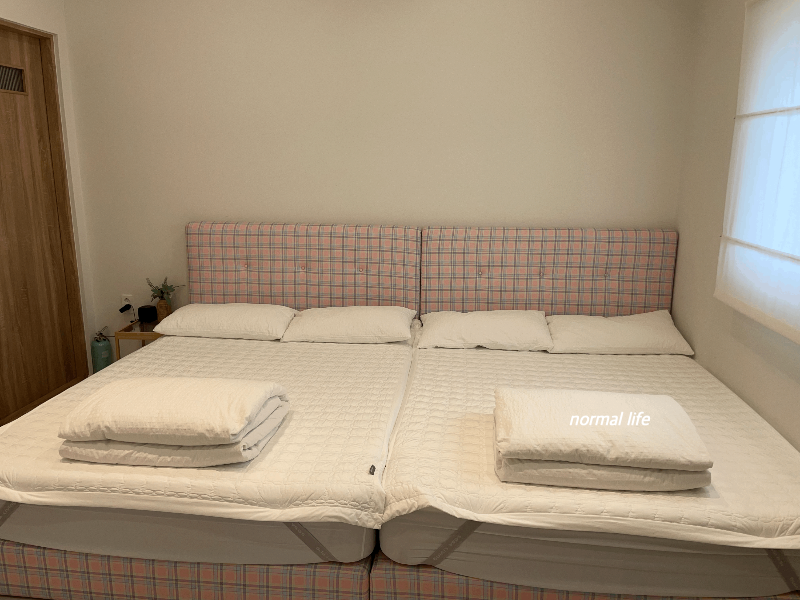 동락풀빌라는 두 개의 방이 있는데 룸 1은 초록체크 더블베드 2개가 준비되어 있고 방 안에 개인욕실도 있었다. 아이와 여행할 때 가장 신경 쓰이는 것이 침구인데, 침구가 모두 알레르망 제품으로 청결하고 가지런하게 준비되어 있어 잠자는 시간까지도 기분 좋은 동락풀빌라였다.