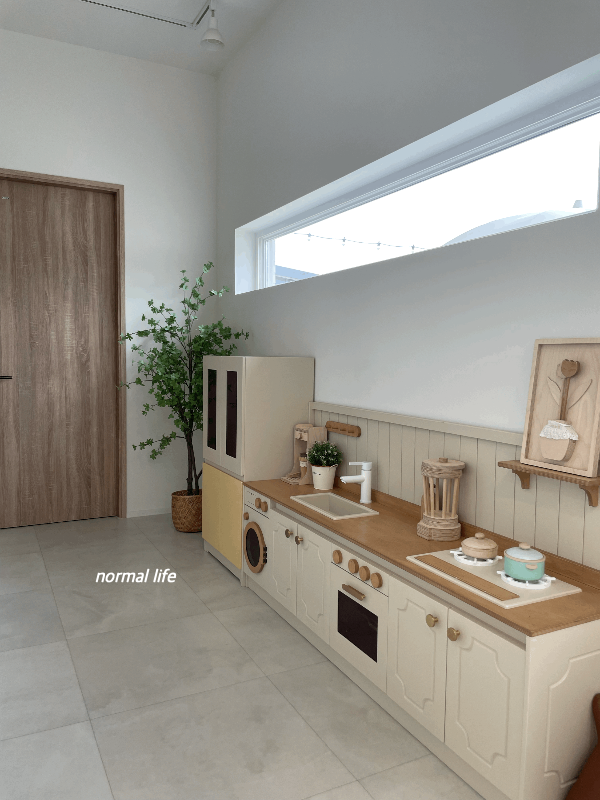 거실 한편에 아이들이 너무도 좋아하는 주방놀이도 준비되어 있다. 널찍한 공간에 냉장고, 세탁기, 오븐, 믹서기, 주방용품 없는 게 없어 아이들이 이 공간에서 너무도 잘 놀아주었다.