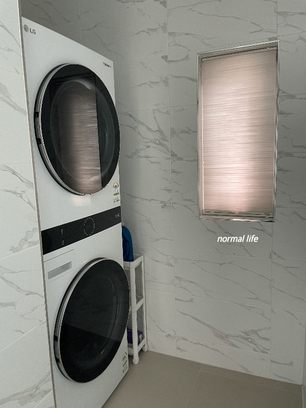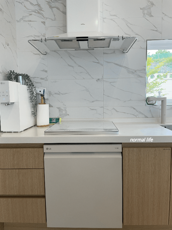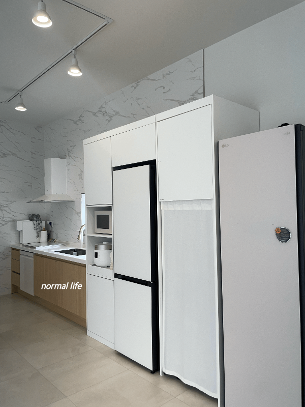 상부장이 없고 화이트톤으로 꾸며져 깔끔하고 넓은 느낌으로 꾸며진 동락풀빌라의 주방모습이다. 동락풀빌라의 가전제품은 식기세척기, 정수기, 냉장고, 인덕션, 스타일러, 청소기, 세탁기, 건조기 모두 LG 오브제컬렉션으로 준비되어있다.
