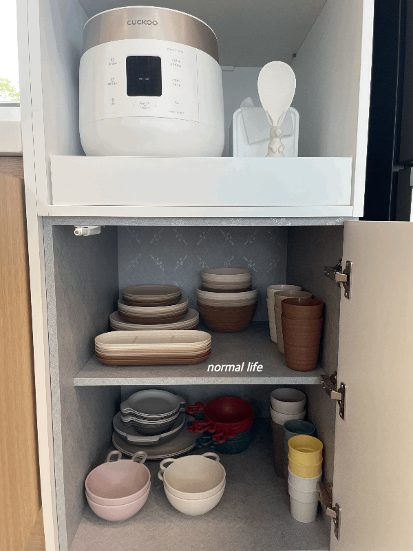 식기세척기 사용이 가능하고 깨질 걱정이 없는 가볍고 예쁜 그릇과 아이들이 좋아하는 귀여운 모양의 그릇과 컵들이 가지런하게 준비되어 있다.