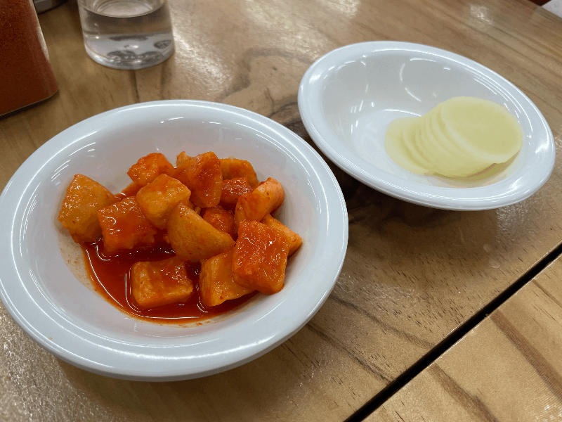 46년간 유지해온 로컬맛집 베테랑칼국수는 단무지까지 직접 만들고 있다고 한다. 베테랑칼국수의 단무지는 무 본연의 색인 흰색으로 은은한 단맛과 새콤함이 특징이고 모든 메뉴와 잘 어울려 깨끗하고 믿고 먹을 수 있는 단무지이다. 베테랑칼국수 매장에는 셀프존에 단무지와 깍두기가 준비되어 있어 마음껏 이용할 수 있다.