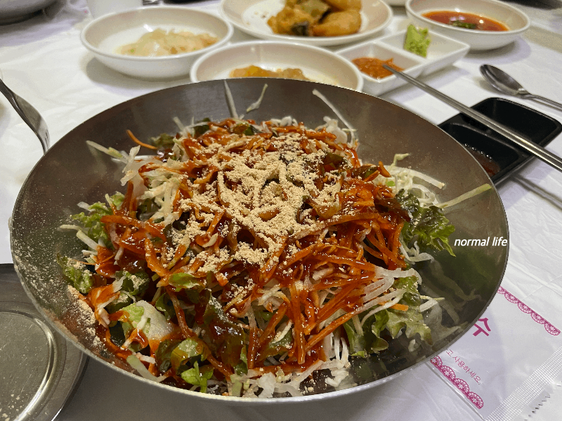다른 생선회와는 다르게 신선한 야채무침과 곁들여 맛보면 더욱 매력적인 송어회이다. 무, 상추, 당근 등 갖가지 신선한 재철 채소들을 매콤한 양념장과 콩가루, 들기름에 버무려 #송어비빔회로 맛보면 아삭함이 더해져 송어회의 매력을 더한다. 송어회만 맛보기 부담스러운 사람도 맛있게 즐길 수 있는 송어비빔회이다.