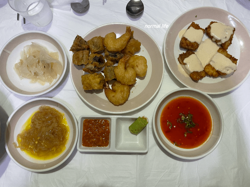 송어 껍데기튀김과 송어를 부담스러워하는 어른과 아이 입맛에 딱인 타르타르소스가 올라간 송어튀김과 통통한 새우튀김이 곁들임 음식으로 제공된다. 송어 껍데기튀김과 송어튀김은 송어회를 추가하거나 추가비용을 지불하면 추가 제공되고 이밖에도 계란찜, 백김치, 해파리냉채가 제공된다.