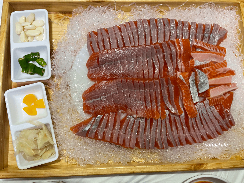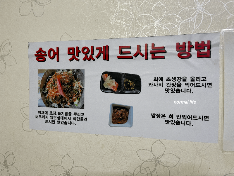 수청가든 벽면에 #송어 맛있게 드시는 방법이라고 다양한 방법이 친절하게 설명되어 있었다. 첫 번째로 신선한 야채에 초장, 들기름을 뿌리고 버무리지 않은 상태에서 송어회만 올려 맛보는 방법, 두 번째로 송어회에 초생강을 올리고 와사비 간장을 찍어먹는 방법, 세 번째로 쌈장에 송어회만 찍어먹는 방법이 설명되어 있었다.
