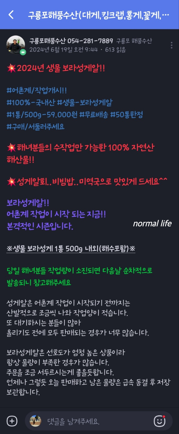 구룡포해풍수산은 평일 오후 4시까지 주문결제 완료 시 #당일발송을 원칙으로 하고 있다고 한다. 기상에나 계절 각 상품 상황에 따라 포장 당일에 맞춤형 종이박스, 산소포장, 아이스박스로 꼼꼼히 #안심포장하고 있다고 한다.