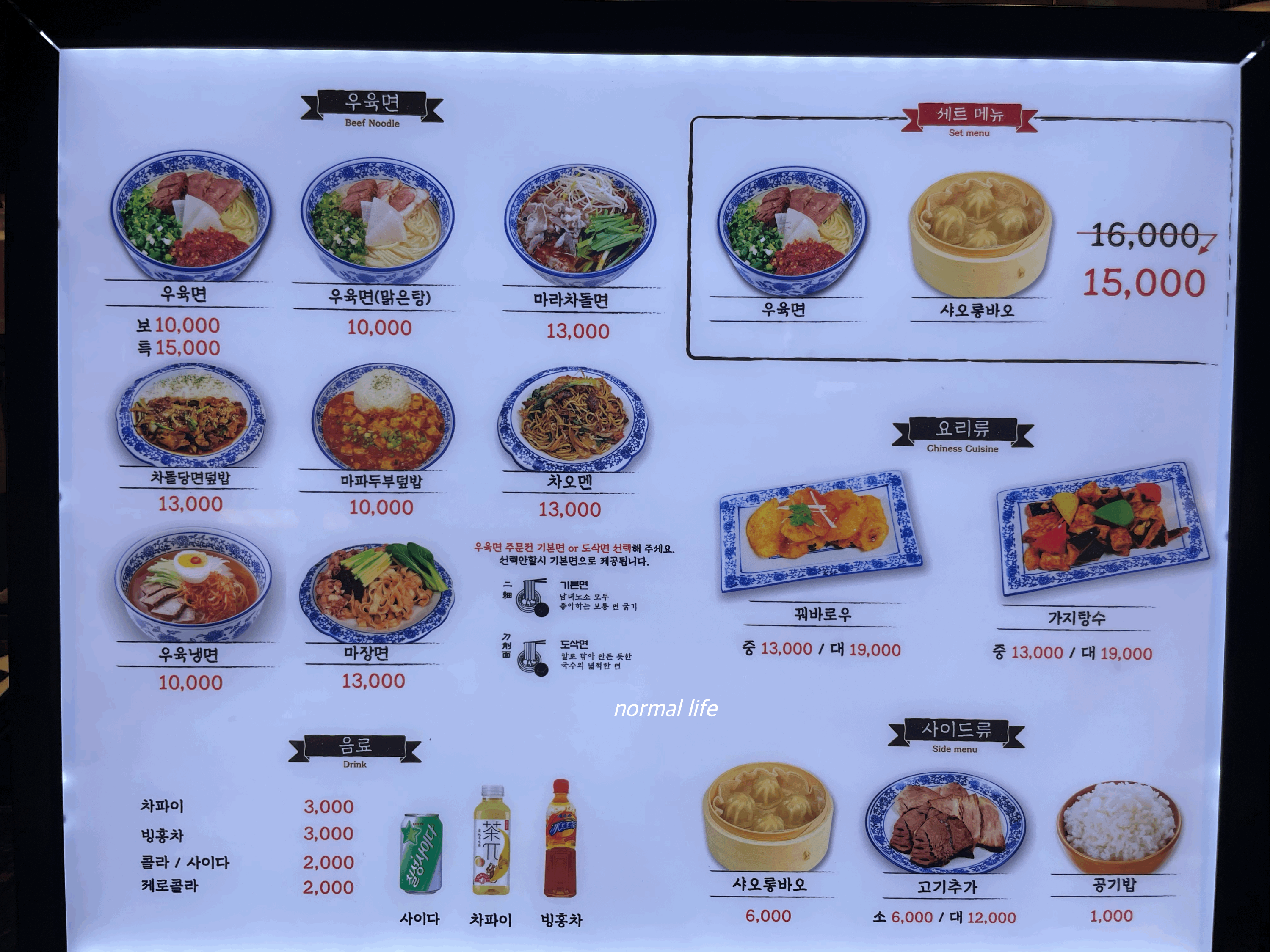 샤오바오우육면은 우육면을 메인으로 #보통 10,000원 #특 15,000원 담백한 맛이 특징인 #맑은탕 우육면 10,000원 #마라차돌면 13,000원 #차돌당면덮밥 13,000원 #마파두부덮밥 10,000원 #차오멘 13,000원 #우육냉면 10,000원 마장면 13,000원 우육면과 육즙 가득한 샤오바오를 함께 즐길 수 있는 세트메뉴 15,000원이다.