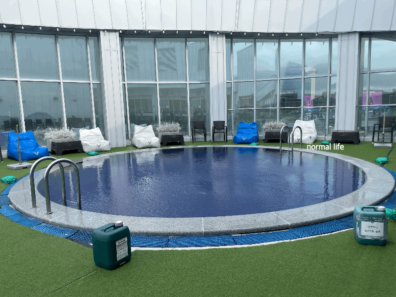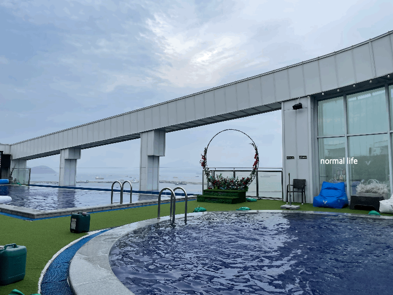 베네치아 호텔&리조트 18층 야외 루프탑에 위치한 수영장은 투숙객과 외부인 모두 이용금액을 지불하면 이용할 수 있다. 투숙객인 우리의 루프탑풀 이용요금은 1+1 행사로 아이와 엄마아빠 이용하여 23,000원에 이용할 수 있었다. 루프탑풀 운영시간은 상황에 따라 조정되고 있는데 내가 방문했던 2024년 7월 18일 19일은 12시부터 20시까지 이용할 수 있었다. 루프탑에 위치해 오션뷰를 바라보며 수영을 할 수 있으나 그늘이 없어 햇빛이 강하지 않은 시간인 오후 5시에 입장하여 마감시간인 8시까지 바다를 바라보며 여유롭게 물놀이를 할 수 있었다. 타월은 1인 1타월로 추가 시 1장당 2,000원을 지불해야 한다.