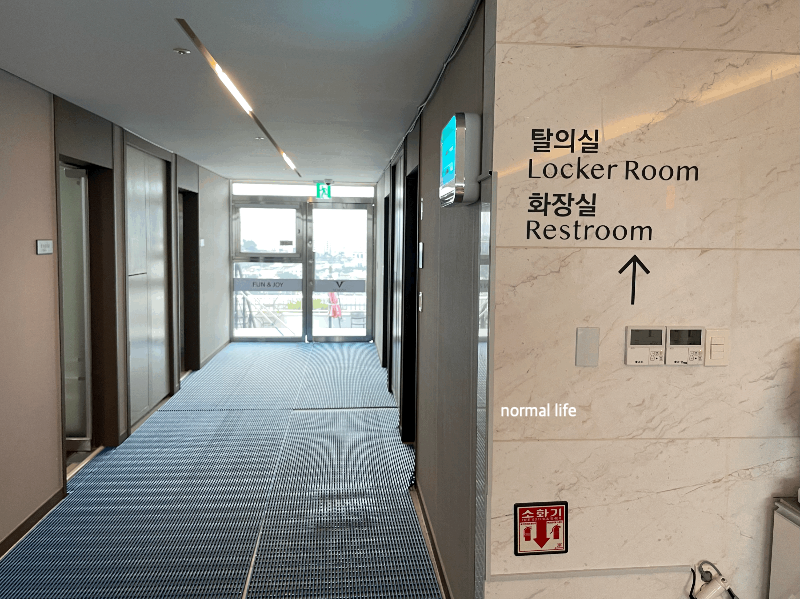 루프탑풀 입장전이나 물놀이 후 이용할 수 있는 탈의실에는 샤워부스와 탈수기가 준비되어 있다.