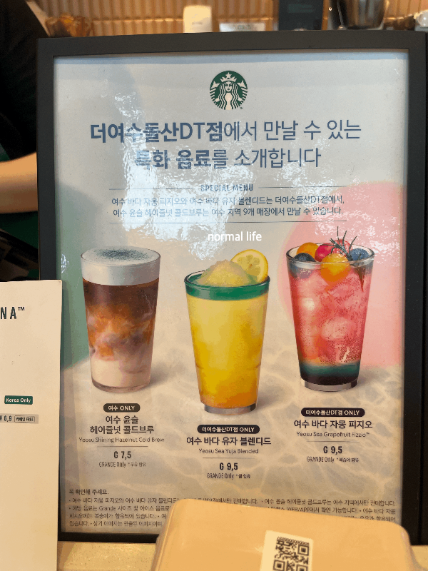스타벅스 더여수돌산 DT점은 전 매장에서 만날 수 있는 음료 메뉴와 여수만의 특색을 접목시킨 특화 음료 3가지를 만날 수 있다. #여수 윤슬 헤이즐넛 콜드블루 G 7,500원 #여수 바다 유자 블렌디드 G 9,500원 #여수 바다 자몽 피지오 G 9,500원이고 더여수돌산 DT점에서만 만날 수 있는 여수 바다 자몽 피지오가 베스트 메뉴라고 한다.