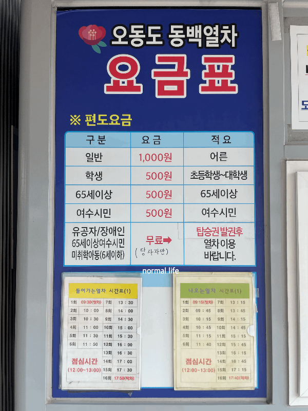 동백열차는 편도 티켓만 판매하고 있어 돌아오는 동백열차는 오동도 하차지점에 있는 매표소에서 다시 표를 구매하여야 한다. 편도요금 어른 1,000원 초등학생에서 대학생 500원, 65세 이상 500원 , 국가유공자 장애인 65세 이상 여수시민 6세 이하의 미취학아동은 무료로 이용할 수 있다.
