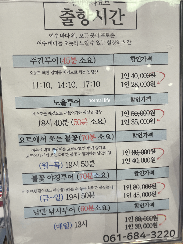 주간투어, 노을투어, 요트에서 불꽃 쏘는 불꽃투어, 불꽃놀이를 볼 수 있는 불꽃 야경투어, 낭만 낚시투어 등 다양한 투어가 준비되어 있다. 사실 70분 불꽃 야경투어가 제일 하고 싶었으나 여수 베네치아 호텔&리조트 루프탑 수영장을 즐기고 아이와 함께 쉬느라 아쉽지만 오동도 해안 일대를 둘러보는 45분 주간코스를 이용할 수밖에 없었지만 아이와 즐기기에는 너무도 좋은 코스였다.