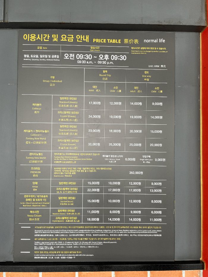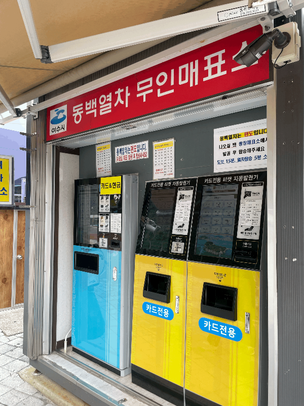 마치 여수바다 위에 떠있는 듯한 경험과 여수바다를 한눈에 바라볼 수 있는 여수해상케이블카는 여수여행의 필수코스이다. 여수해상케이블카는 예약 없이 현장발권과 온라인발권이 가능하다. 할인이 가능한 온라인 발권은 당일 사용이 불가능하고 온라인 발권 다음날부터 사용이 가능하여 우리는 돌산 정류장 무인발권기에서 당일 티켓을 구매하였다. 우리는 일반캐빈 왕복 대인 17,000원 2인 소인 12,000원 46,000원을 지불하고 왕복티켓을 구매하였다.